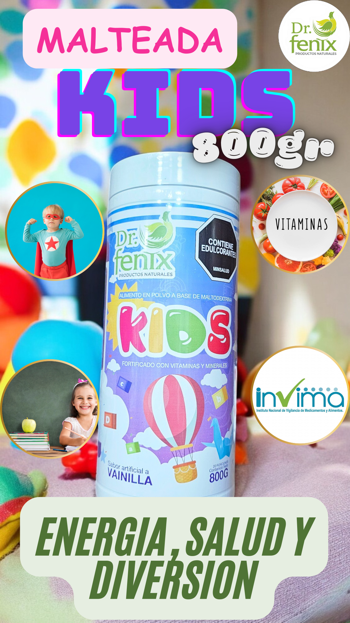 KIDS, el aliado perfecto para fortalecer la salud y el desarrollo de tus niños. Malteada de 800 gr con vitaminas, minerales y proteína de alta calidad, fomenta el crecimiento físico, cognitivo y emocional.